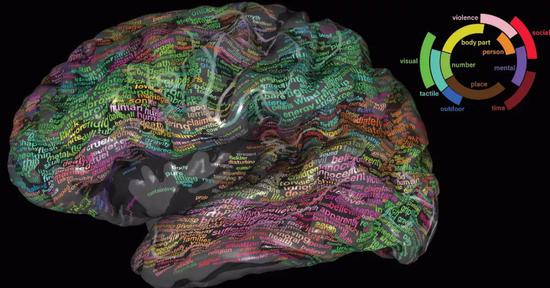 Gallant是加利福尼亚大学伯克利分校的神经科学家,他发表过几张大脑的图册。其中一项是2016发表在《自然》上的研究,展示了不同意义的词汇都储存在大脑皮层的什么位置。在这份语义地图中,包含了各种各样的单词,从身体部位到数字再到一些原理相关的词语。"我们的方法展示了fMRI可以提供的最精准的细节东西,"Gallant告诉我。这个图册展示了各种语义储存在大脑中的地方,比如"狗"这个单词引起的活动会出现前额叶、顶叶和颞叶皮质。
