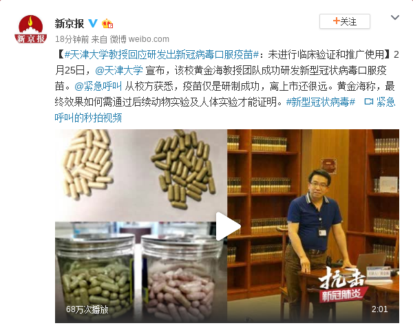 天津大学教授回应研发出新冠病毒口服疫苗 二月 24, 2020 获取链接 Facebook X Pinterest 电子邮件 其他应用 天津大学教授回应研发出新冠病毒口服疫苗 原标题:天津大学教授回应研发出新冠病毒口服疫苗:未进行临床验证和推广使用 2月25日,@天津大学 宣布,该校黄金海教授团队成功研发新型冠状病毒口服疫苗。@紧急呼叫 从校方获悉,疫苗仅是研制成功,离上市还很远。黄金海称,最终效果如何需通过后续动物实验及人体实验才能证明。 评论